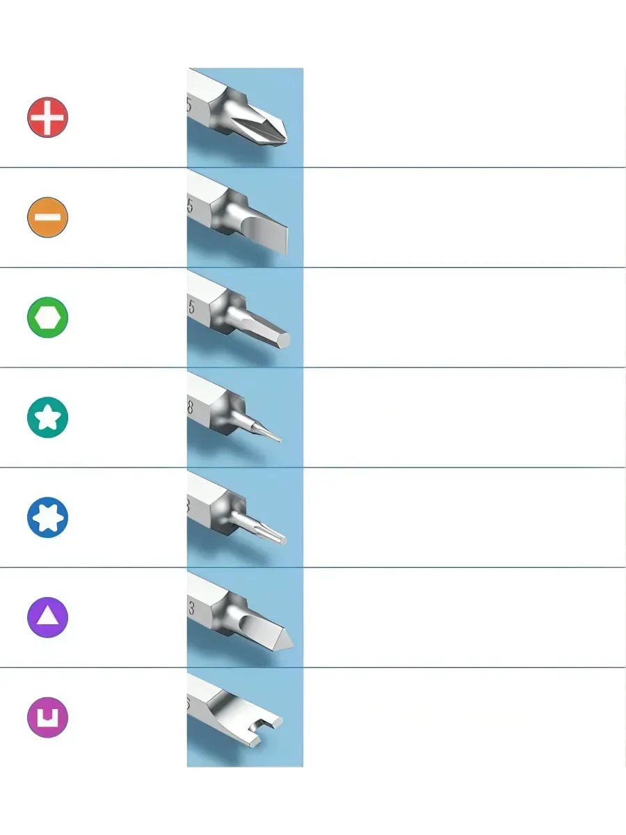 | Tipuri de biți | Phillips – 1.0, 1.5, 2.0, 2.5, 3.5, Cap plat – 1.0, 1.5, 2.0, 2.5, 3.0, 3.5, 4.0 Pentalobe (cu cinci vârfuri) – 0.8, 1.2 Torx – T3 – T10 + T15, T20 Tri-wing – 0.8, 2.0 Cheie fixă - 1.6 Stea – 0.8, 1.2 Pozidriv – Y0.8, Y2.0 |